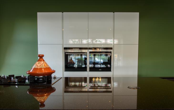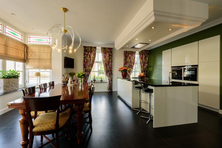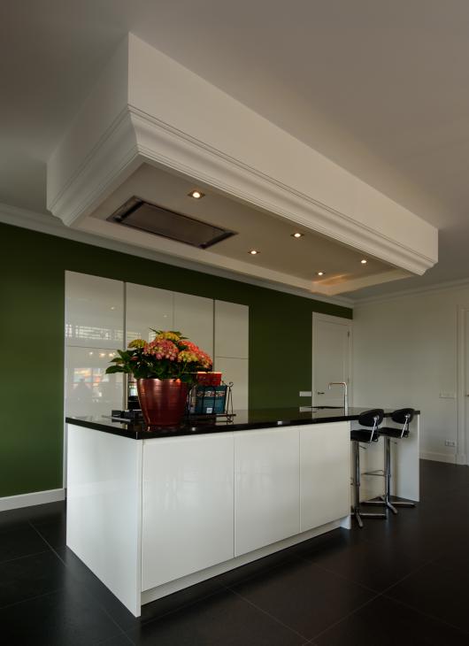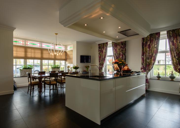 Greeploze hoogglans wit gelakte keuken met kookeiland en ingebouwde kastenwand in combinatie met klassiek interieur.